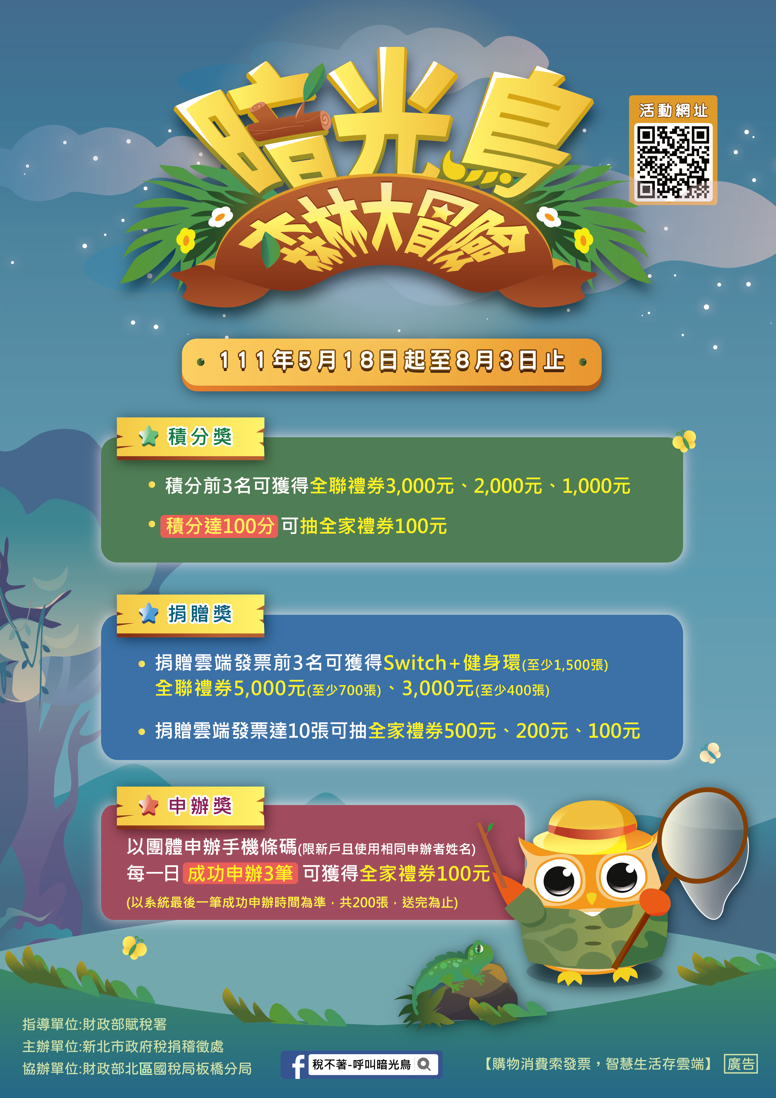 本市稅捐稽徵處於111年5月18日至8月3日舉辦「暗光鳥森林大冒險」網頁互動遊戲,活動訊息如下: