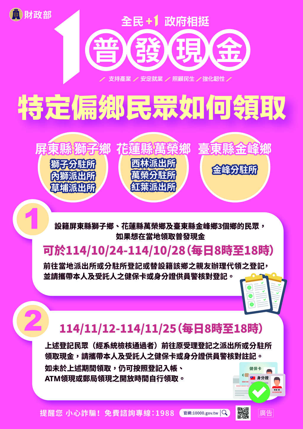 為強化民眾消費韌性,擴大內需,提振經濟效益,財政部依因應國際情勢強化經濟社會及民生國安韌性特別條例第3條第11款規定發放現金每人新臺幣1萬元,並採「登記入帳」、「ATM領現」、「郵局領現」、「直接入帳」及「造冊發放」等5種方式,便利民眾領取。