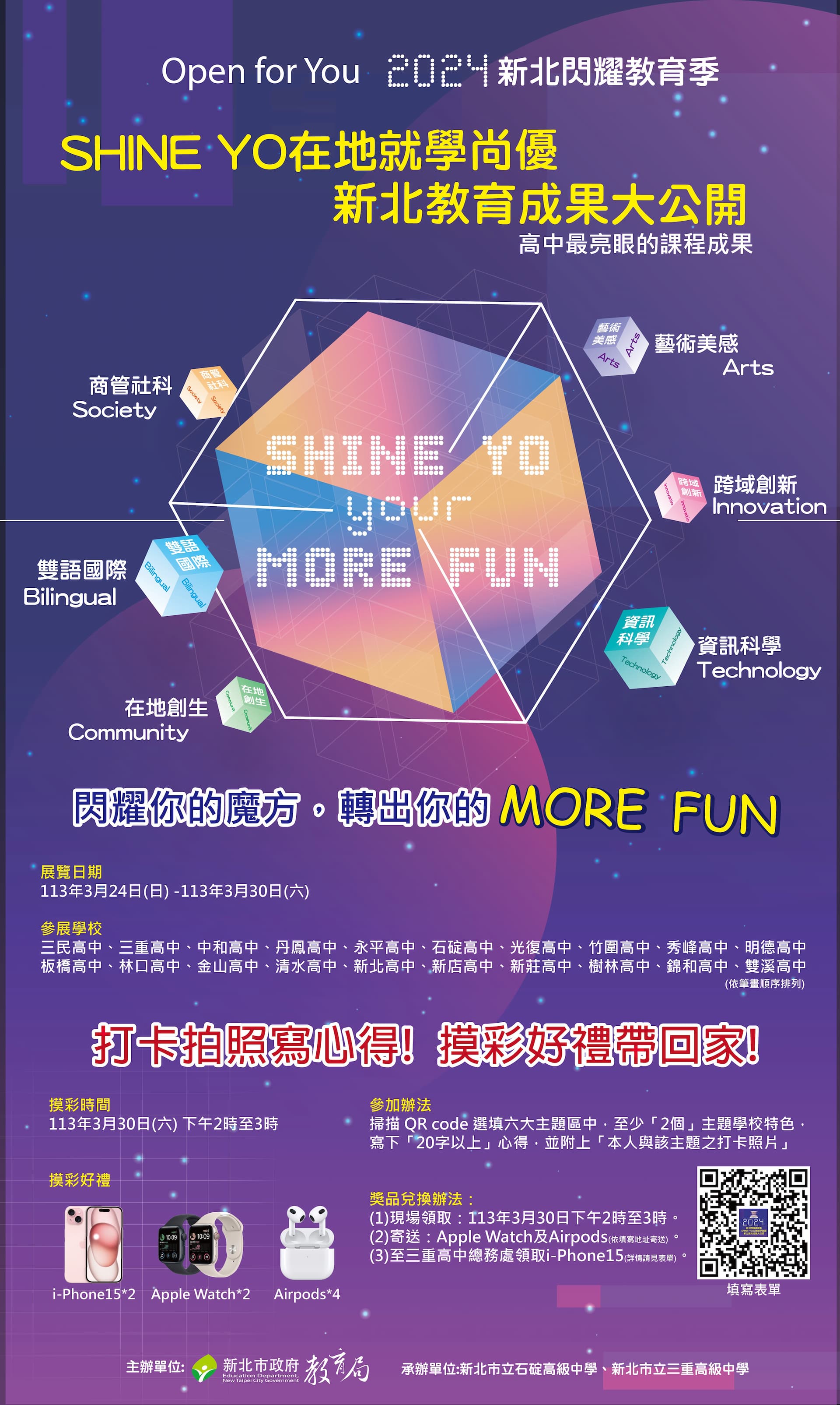 办理新北OPEN DAY首发场暨教育季启动记者会、学习历程档案工作坊、青年创生论坛、新北教育博览会、自主学习论坛、新北教育成果大公开、数位走读小旅行、新北校校OPEN DAY等多元活动,共同呈现新北教育的活力与创意地点:新北高中、板桥高中、永平高中、锦和高中、三民高中、双溪高中