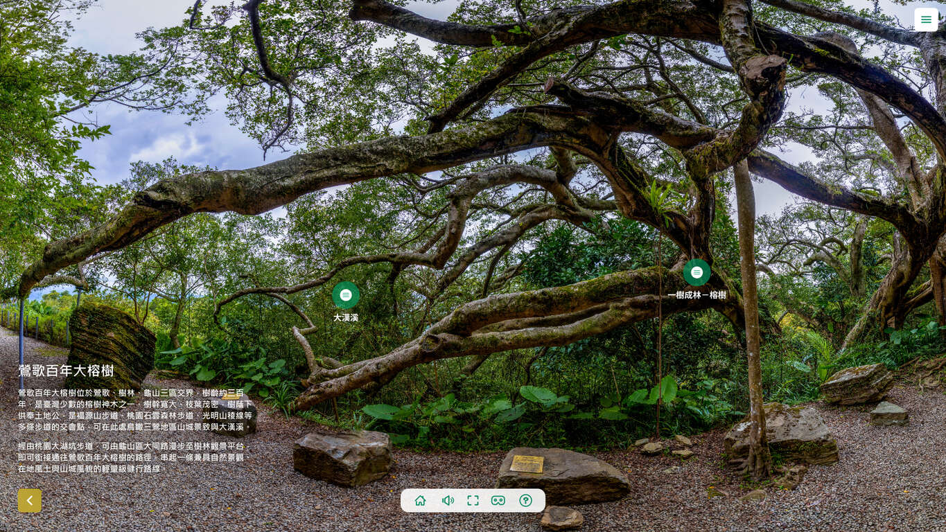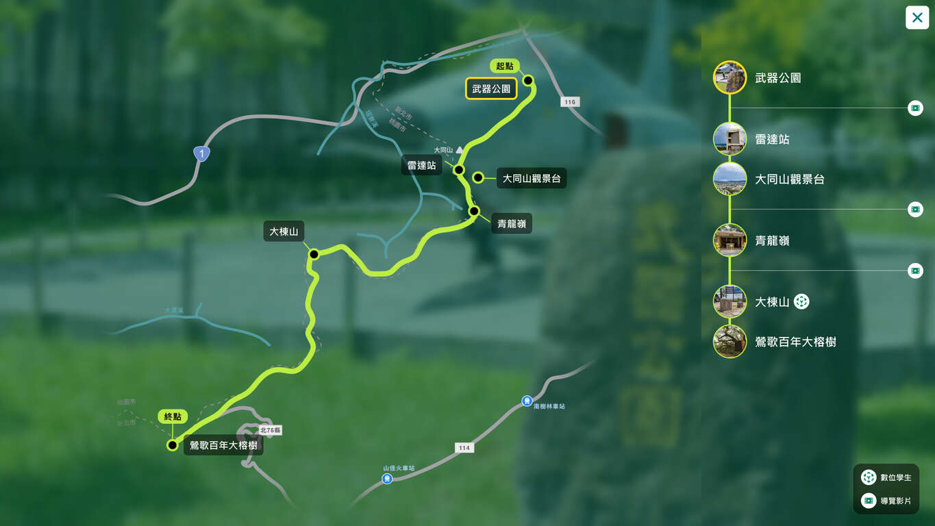 系统特别采用超高解析全景并结合数位孪生技术,使用者能自由切换视角,细致观察武器公园的历史遗迹、雷达站的开阔视野,以及百年大榕树的苍劲姿态。配合在地生态解说及步道文化介绍,搭配环境音效与AI语音导览,打造沉浸式的数位体验,让民众在家也能预先规划行程,实际走访时更能深度体验。