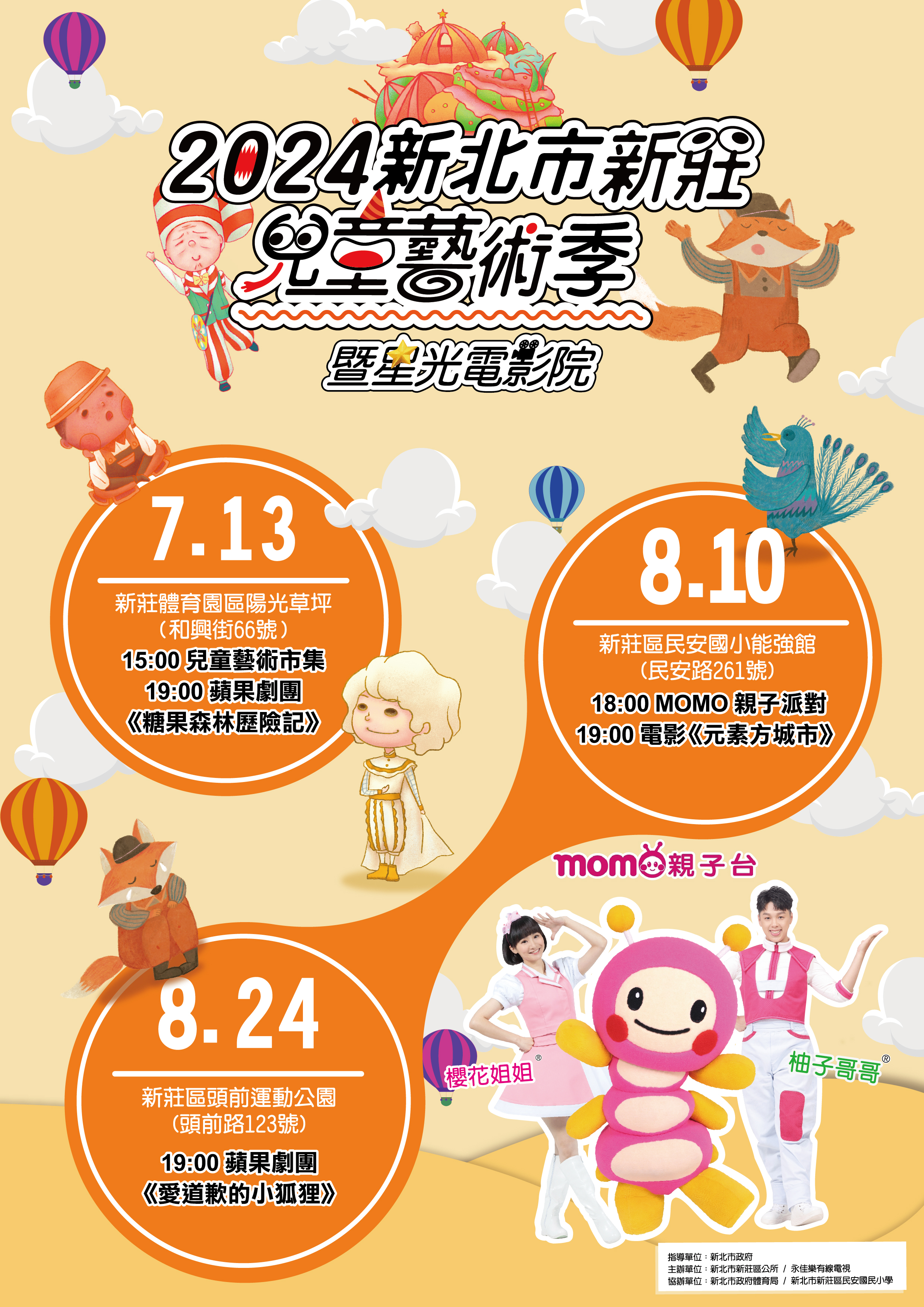 邀請臺灣知名兒童劇團至新莊區演出,透過創意又多元的兒童劇題材與表演方式,延伸孩子們的想像空間及創意發展,除了邀請劇團演出,此次也增加播放動畫影片的電影院模式,邀請大家一起來欣賞電影,培養從小參與藝文活動的習慣,在文化深耕的過程中活絡親子關係,並在觀賞中留下美好回憶。