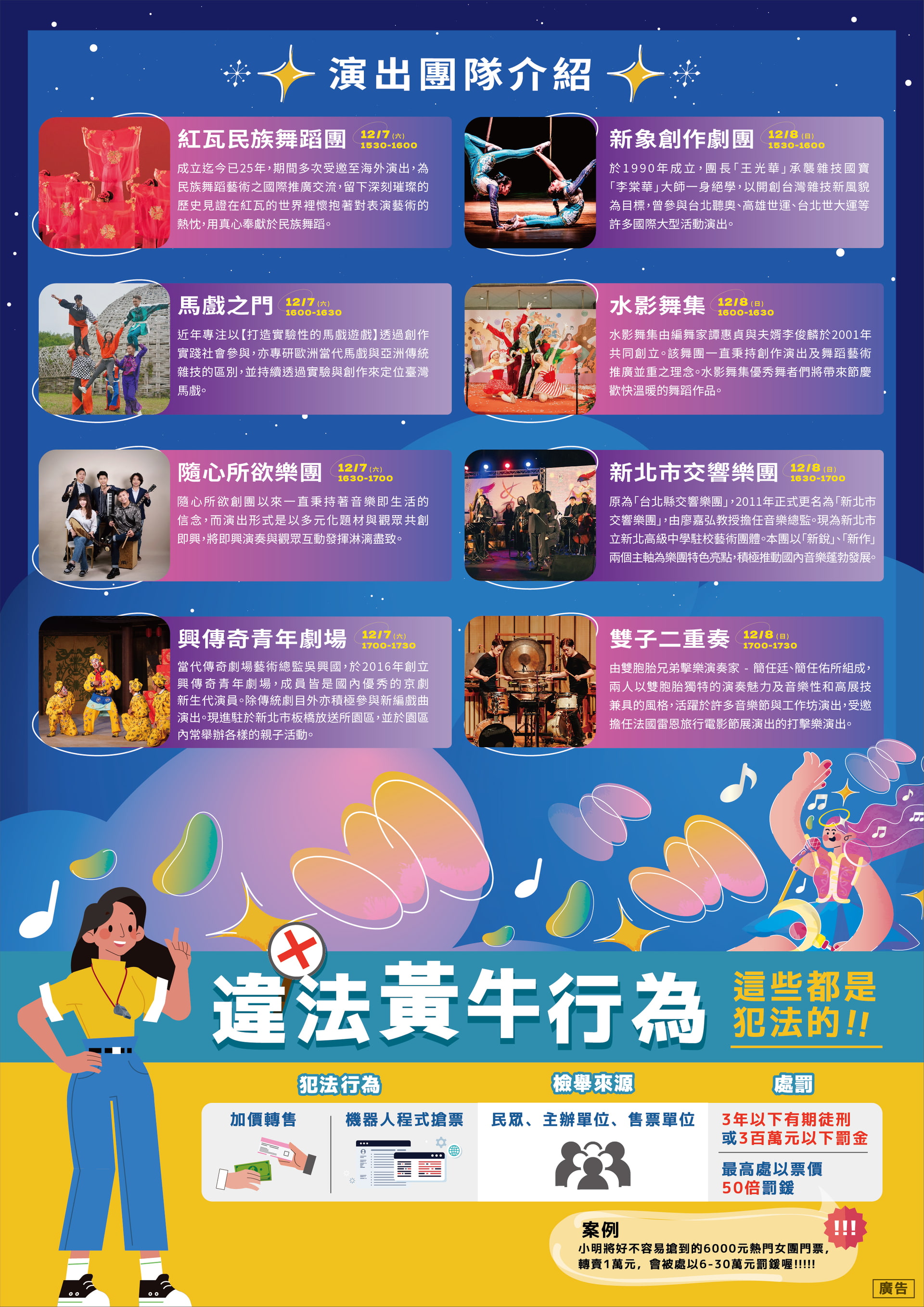 節目包含戲劇、舞蹈與音樂等多元類型,匯集新北市優質的演出團隊,讓觀眾們可以在耶誕城期間感受冬日藝術活力,欣賞來自不同團隊的特色節目,度過歡笑趣味的週末派對。