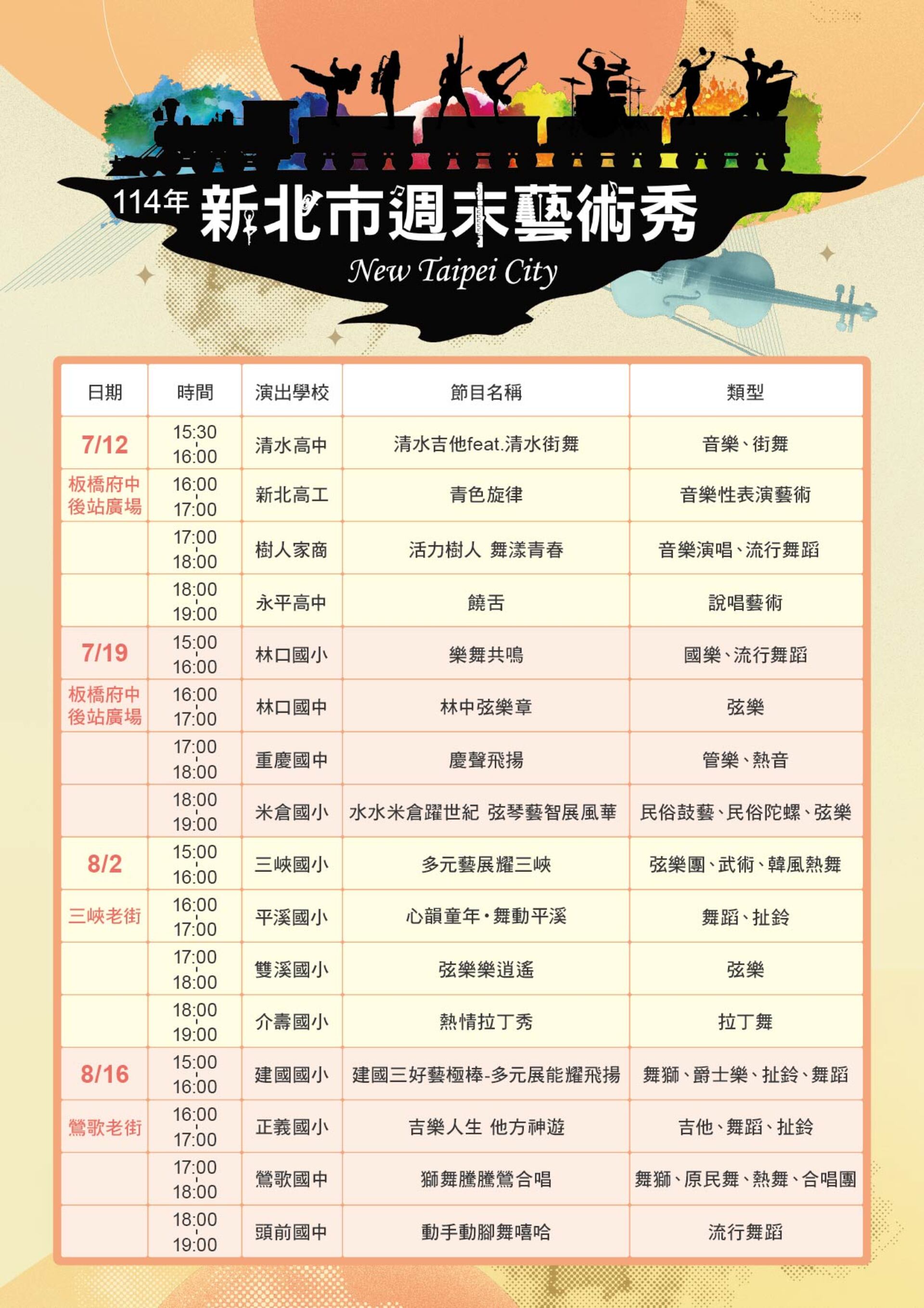 暑假期間邀請本市各級學校所屬之優秀音樂、舞蹈、民俗技藝等藝術團隊,於本市境內各著名觀光景點,以輕鬆活潑的表演方式,舉辦豐富多元的假日藝術饗宴活動,讓市民擁有體驗及探索藝術之美的機會,培養渠等欣賞藝文活動的樂趣,使「生活藝術化,藝術生活化」。