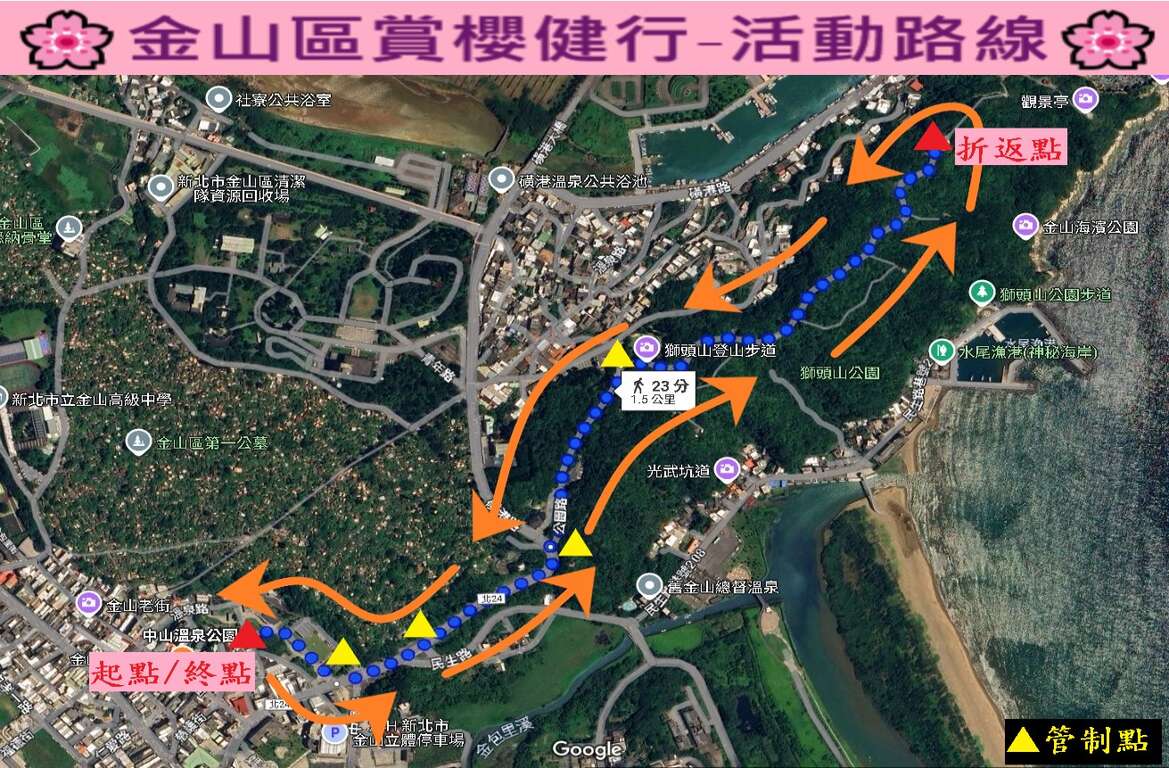 健行路線|中山溫泉公園(起點)→民生路→公園路→獅頭山風景區(折返點)→公園路→民生路→中山溫泉公園(終點)