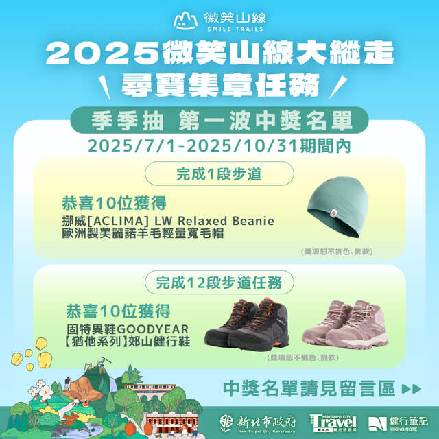 【💎2025微笑山線大縱走】 #中獎公告🎉 尋寶集章任務第一波「季季抽」幸運名單出爐啦~🌿✨ 感謝大家熱情參與「走進新北微笑山線」活動💚2025-11-06