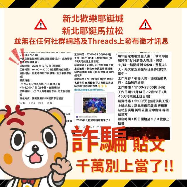 🚨【#小客防詐提醒】🚨 最近出現假粉專冒充官方帳號假冒名義舉辦活動 以及假借活動名義招募「新北耶誕工讀」人員! 再這樣小客真的要生氣囉!😤2025-10-17
