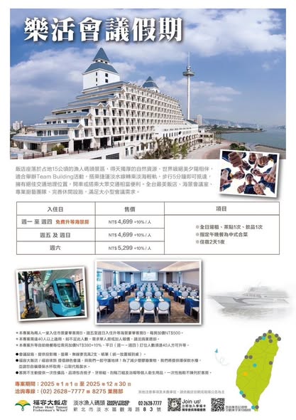 #新北市唯一五星級飯店 座落於占地15公頃的漁人碼頭景區,得天獨厚的自然資源,世界級絕美夕陽相伴,非常適合舉辦Team Building活動,搭乘捷運淡水線轉乘淡海輕軌,步行5分鐘即可抵達,擁有絕佳交通地理位置,開車或搭乘大眾交通相當便利。全台最美飯店、海景會議室、專業廚藝團隊、完善休閒設施,滿足大小型會議需求。