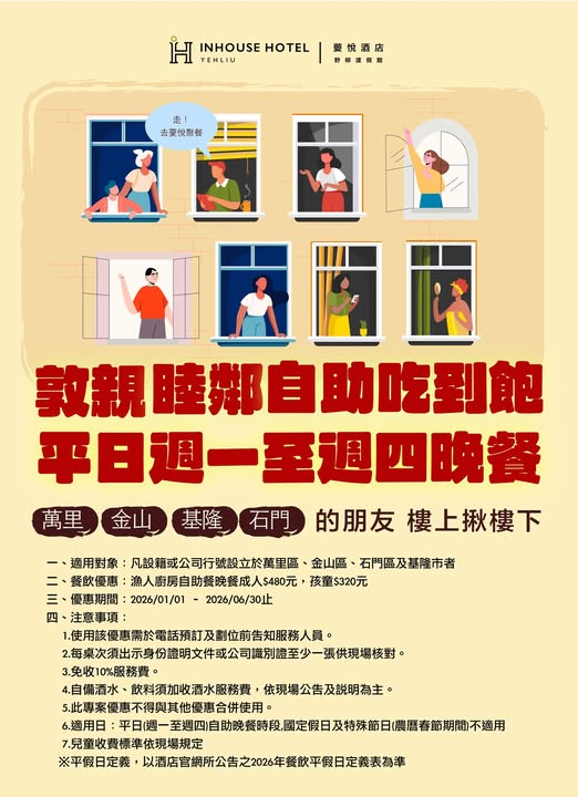 為回饋週邊鄰里好朋友對薆悅酒店-野柳渡假館的支持與愛護,凡是設籍新北市『金山區/萬里區/石門區」以及基隆市『全區』的好鄰居們,至野柳薆悅用餐 每人只要 $480(你沒看錯,吃到飽只要 $480)😍😍😍孩童只要$320元