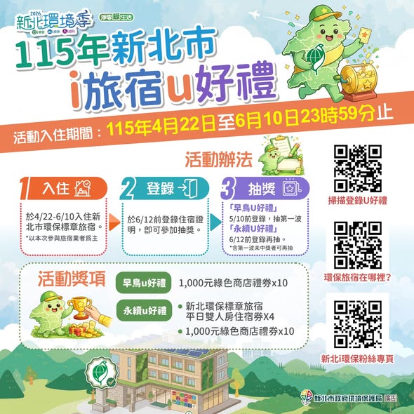 新北市環保局特別推出期間限定活動 #i旅宿u好禮, 只要入住環保旅宿,就能參加抽獎: